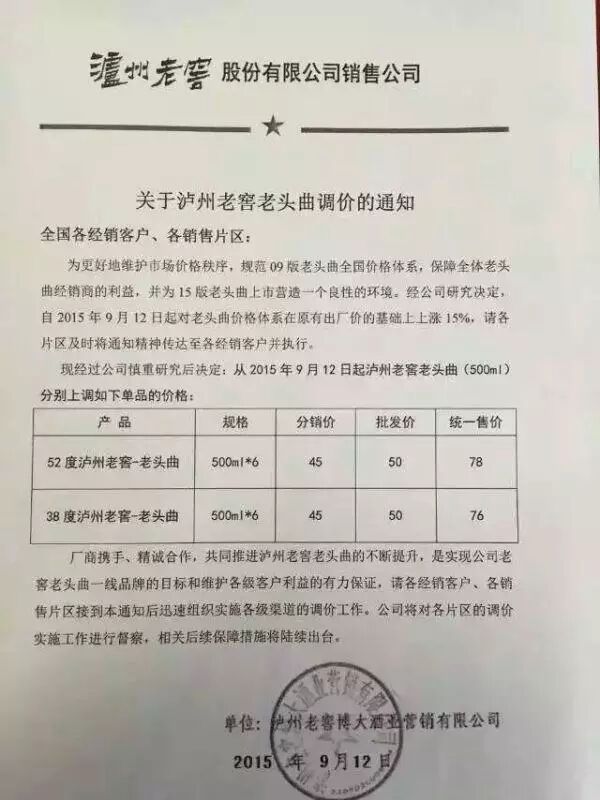 9月21日,微酒记者独家获悉,泸州老窖方面9月上旬发布了泸州老窖头曲产品上调价格的通知,该通知称:为规范09版老头曲全国价格体系,保障全体老头曲经销商的利益,并为15版老头曲上市营造一个良好的环境,从2015年9月12日起,对老头曲价格体系在原有出厂价基础上上调15%,上调后,泸州老窖老头曲(500mlx6)高度和低度的批发价款均为50元,零售价分别为78元和76元。