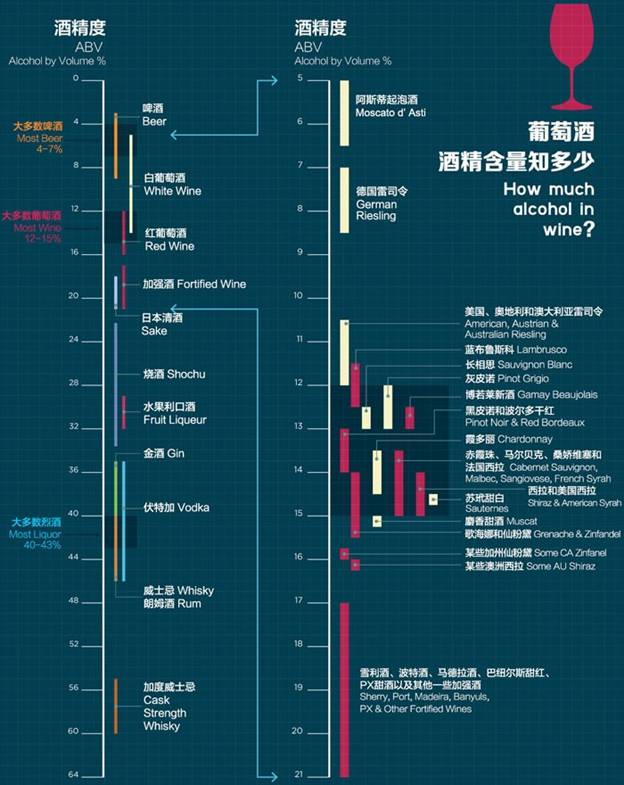 下面就来看看具体类型啤酒、葡萄酒及烈酒的酒精含量: